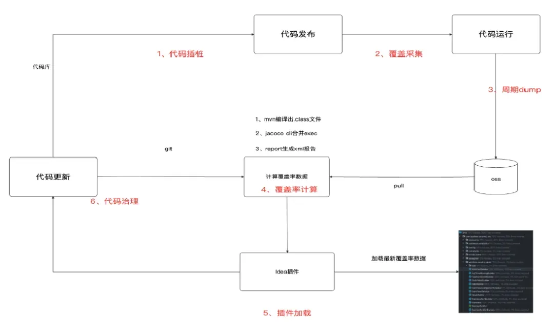 - 数据合并:代码执行情况的采集数据与最新代码版本生成完整代码覆盖情况;(最终代码覆盖=.exec文件+.class文件)