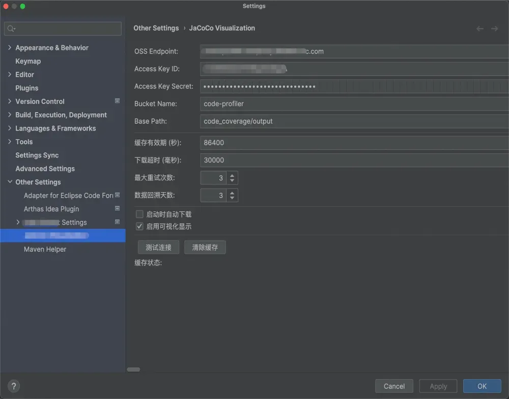 - 插件配置:支持配置插件相关的参数,例如oss的配置、下载最近N天数据、缓存周期、下载超时等;
