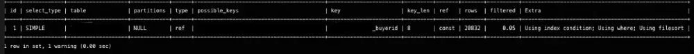 据此该SQL实际执行过程中是命中索引 `ind_***_buyerid` ,其中buyer_id走索引过滤(key_len等于8),is_main等大部分字段都在索引里面,通过索引下推过滤(Using index conditions),只有两个字段不在索引中通过回表查过滤(Using where)。这两个字段正常满足条件的比例不超过1%,因此即使回表查扫描行数也不会大幅上涨。出现问题的可能原因就是这里的Using filesort,这种方式下需要把所有满足条件的记录都过滤出来再排序,排序完成再取前10条,导致扫描行数和逻辑读异常。