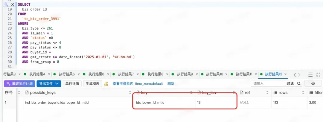 查询条件中带有create_time的范围查询,理论来说走老索引ind_***_buyerid更优,可以走索引过滤而不是索引下推过滤。实际测试发现当查询时间是2025-08-01会走老索引ind_***_buyerid,如下:
