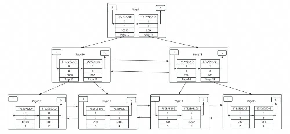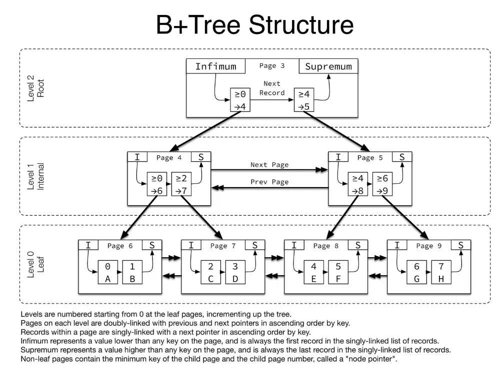 B+Tree中单个节点实际对应一个16kb的物理Page,Page的Fil Header中会维护两个链表指针,指向相邻的两个Page,通过这两个指针,每一层的Page都会组成一个横向的Page双向链表,从而支持双向遍历,提升列表查询效率。每个Page中会包含多条索引记录Record,各个Record在逻辑上基于索引列值升序排列并组成一个单向链表,这些称为User Records。Page内预留了两个固定位置固定值的System Records,在链表头的Infimum记录以及在链表尾的Supremum记录,Infimum指向索引值最小的Record,Supremum通常为null。Page内部还会维护一组Directory slot,每个Directory slot指向一个Record记录,两个Directory slot对应的Record记录中间会相隔4到8个Record记录,实际在Page内部查找满足条件的Record记录时先根据Directory slot做二分查找找到相邻的两个slot记录,再顺序遍历这两个slot中间的Record记录,从而提升查找效率。