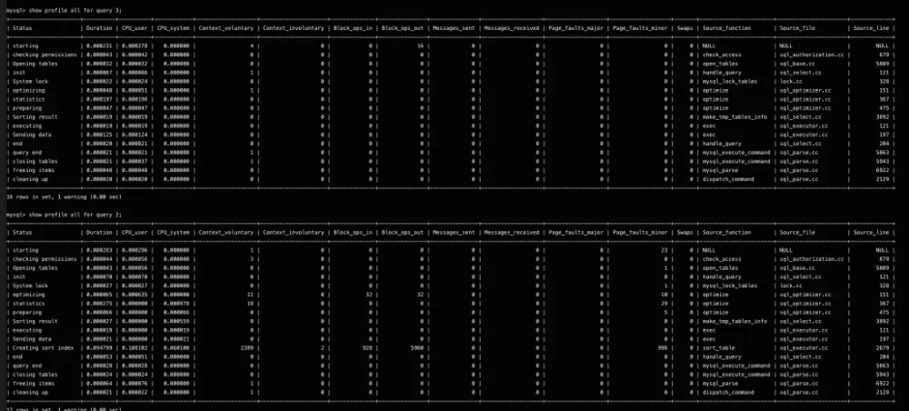 上述猜想可以通过mysql的show profile执行过程来验证,如下: