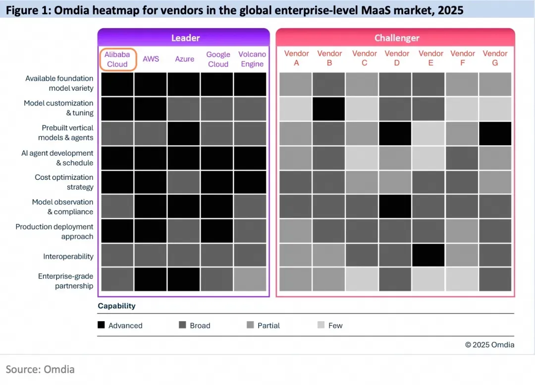 18日,国际市场研究机构Omdia发布最新报告《2025年全球企业级MaaS市场分析》(以下简称“报告”),提出9项评估维度。阿里云获评全球领导者,并在5大维度上获得最高评级,为中国第一。