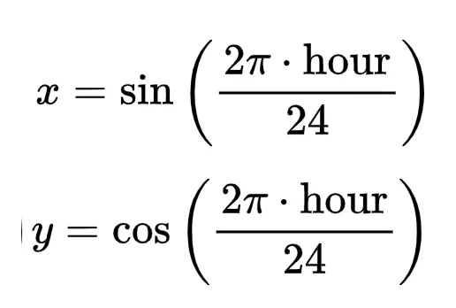 24小时是一个闭环,我们的编码方式也得闭环。把每一个小时想象成圆周上均匀分布的点,要确定圆上一个点的位置单靠一个数值是不够的,我们需要两个坐标: x and y