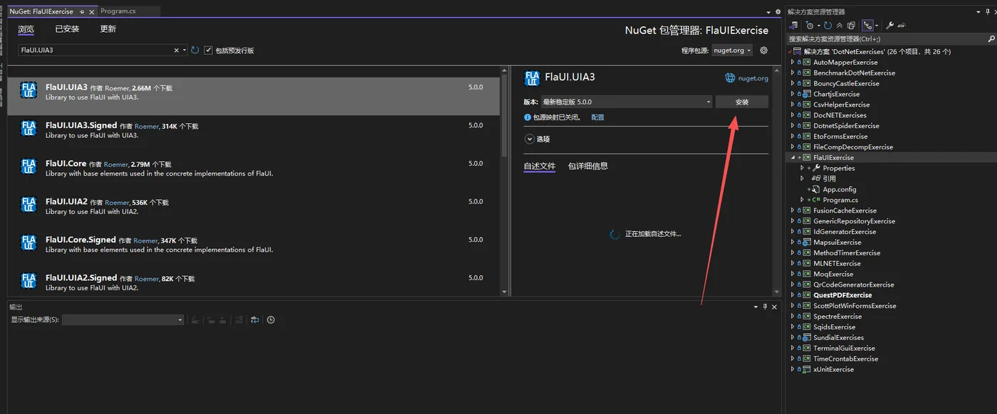 在 NuGet 包管理器中搜索 FlaUI.UIA3 安装: