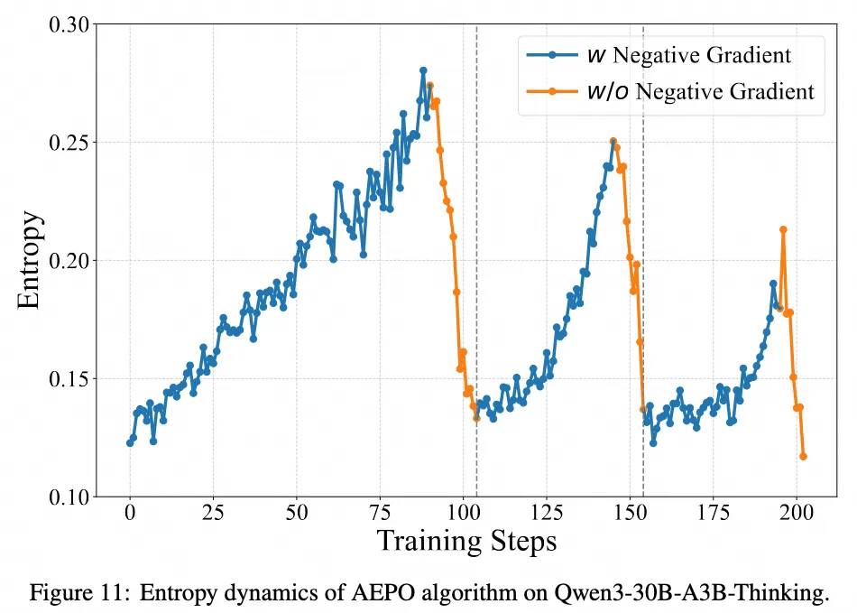 当模型在高不确定性(高熵)状态下生成了错误答案时,AEPO会主动屏蔽(mask)其负向梯度。这保护了模型的探索性行为,避免因惩罚不成熟的尝试而丧失学习潜力。 反之,当模型在 高置信度(低熵)状态下依然犯错时,负向梯度会被正常施加,以坚决纠正这些高置信度的错误。 通过这种动态的、智能的梯度控制,AEPO将模型策略的熵稳定在一个健康的区间,完美平衡了探索与利用,从根本上解决了长文本RL中的不稳定性问题。