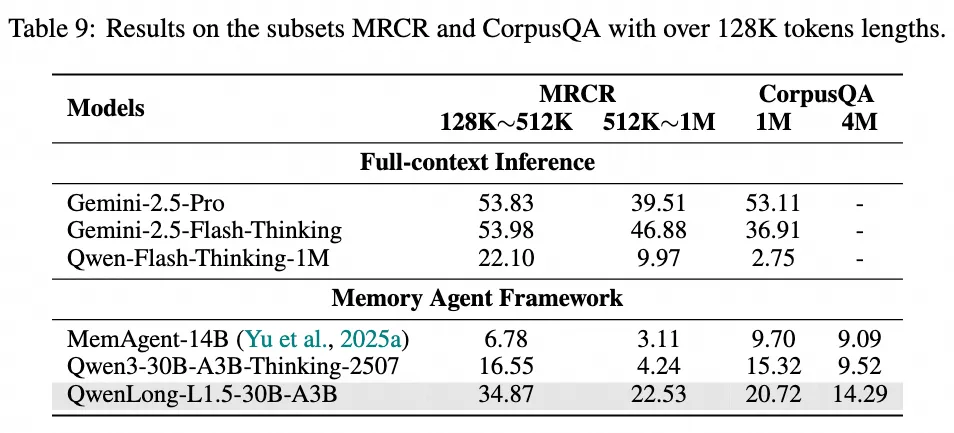 结果显示,QwenLong-L1.5 在这些极限挑战中,性能远超同类智能体方法,充分验证了框架强大的可扩展性。这表明,QwenLong-L1.5 不仅提升了模型在窗口内的能力,更赋予了它突破物理窗口限制、处理无限信息流的巨大潜力。