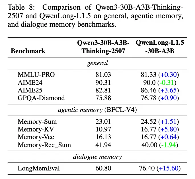 实验结果显示,经过长文本强化训练后,QwenLong-L1.5不仅没有出现“偏科”或“遗忘”,反而在一系列通用能力上也获得了显著提升: