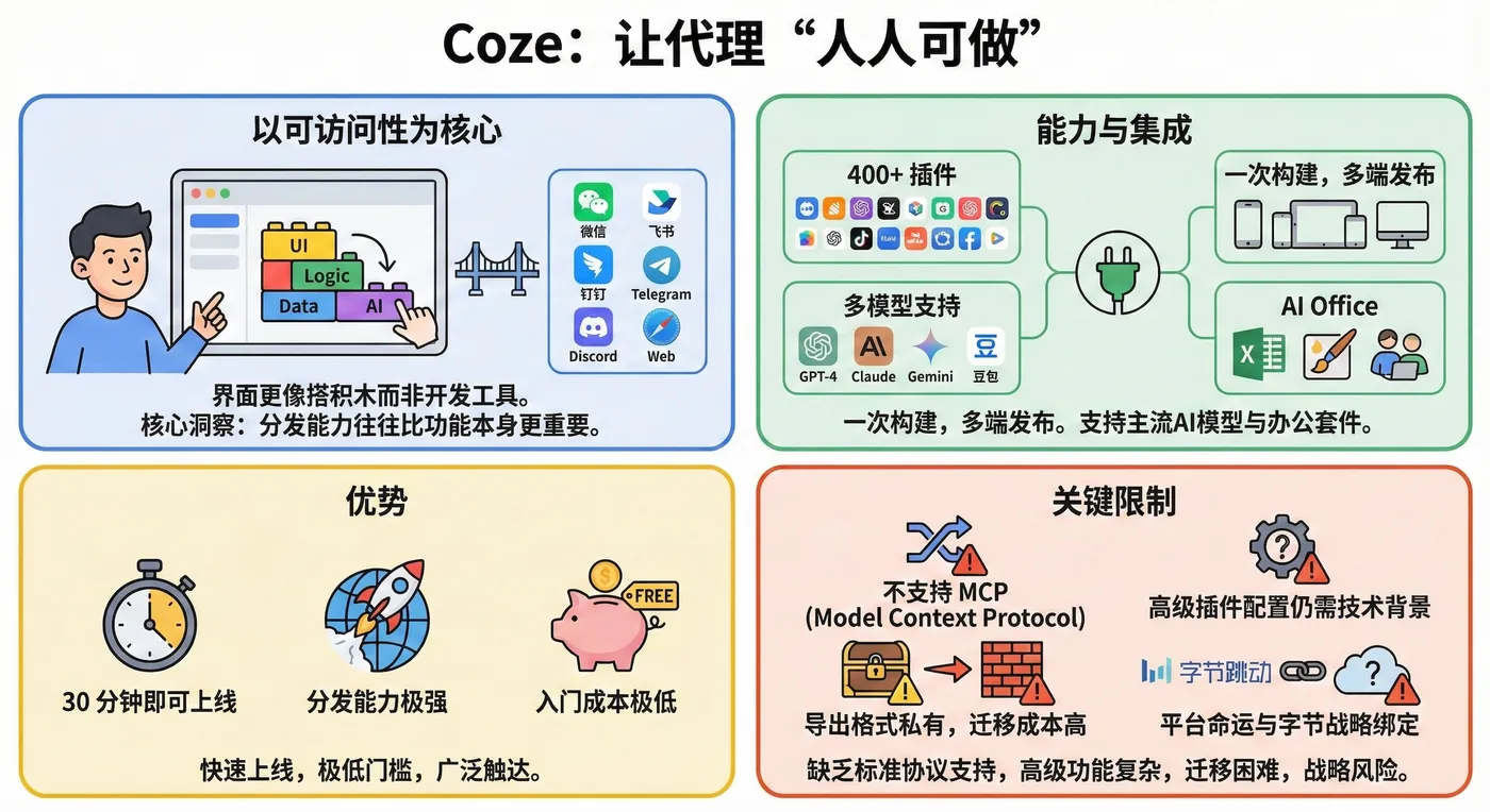 分发倍增器是 Coze 的独特优势。从单一界面发布到多个平台解决了一个实际问题。大多数成功的智能体应用程序需要出现在用户已经花费时间的地方。Coze 让这变得简单直接。