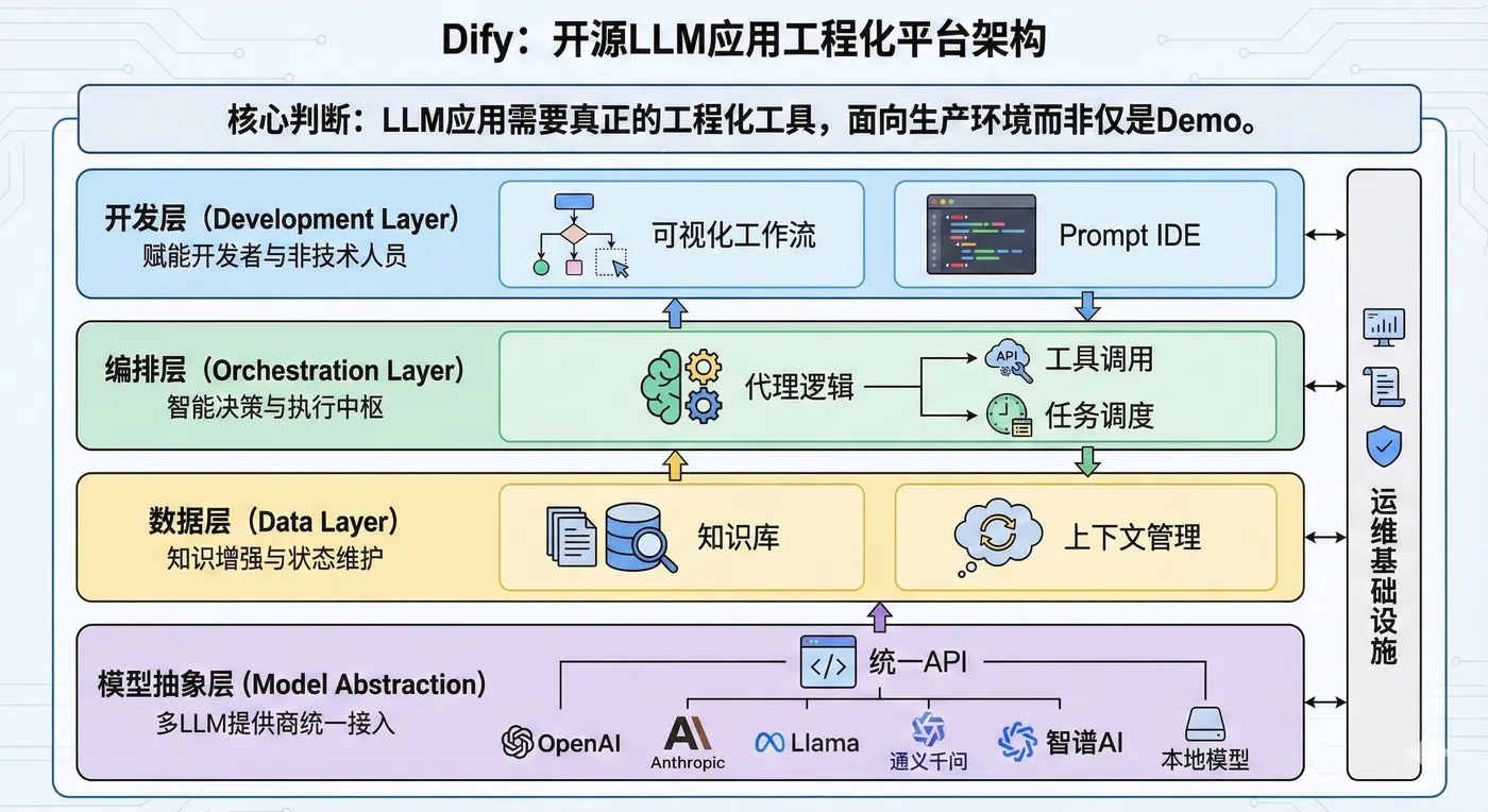 Dify 诞生于这样一种认识:LLM 应用开发需要适当的工具。它是一个开源平台,将工作流编排、检索增强生成 (RAG)、智能体能力和运维基础设施聚合成一个系统。更重要的是,它从第一天起就是为生产就绪(Production-Ready)而设计的——团队显然是为那些需要服务真实用户而不仅仅是原型的应用程序设计的。