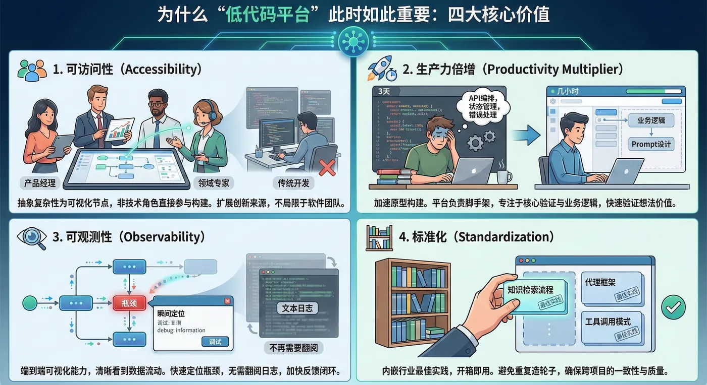 • 首先是可访问性(普及性)。 传统的智能体开发(如 ReAct 和 Plan-and-Solve 框架)要求扎实的工程基础。你需要理解 API 编排、状态管理、错误处理和并发执行。低代码平台将这些复杂性抽象为可视化的节点。产品经理、领域专家和业务分析师现在可以参与构建智能体,而无需等待数周的工程周期。这将创新的人才池扩展到了软件团队之外。