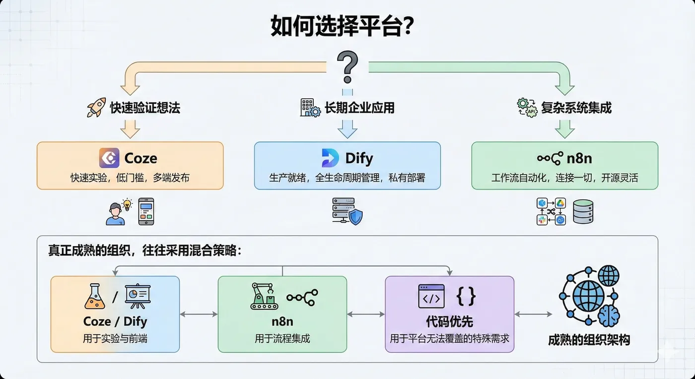 最成熟的组织正在采用混合方法。他们使用 Coze 或 Dify 进行快速实验和面向客户的应用程序。他们利用 n8n 将 AI 能力集成到现有的业务流程自动化中。他们使用代码优先开发来处理平台无法有效处理的特殊需求。