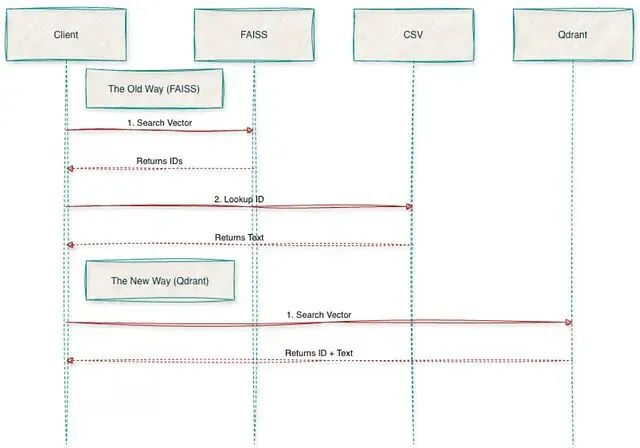 用过 FAISS 就知道为了把向量 ID 映射回文本,还需要额外维护一个 CSV 文件。迁移到 Qdrant 后这些查找逻辑都删掉了,文本和向量存在一起,直接查询 API 就能拿到完整结果,不再需要管理各种文件,就是在用一个微服务。