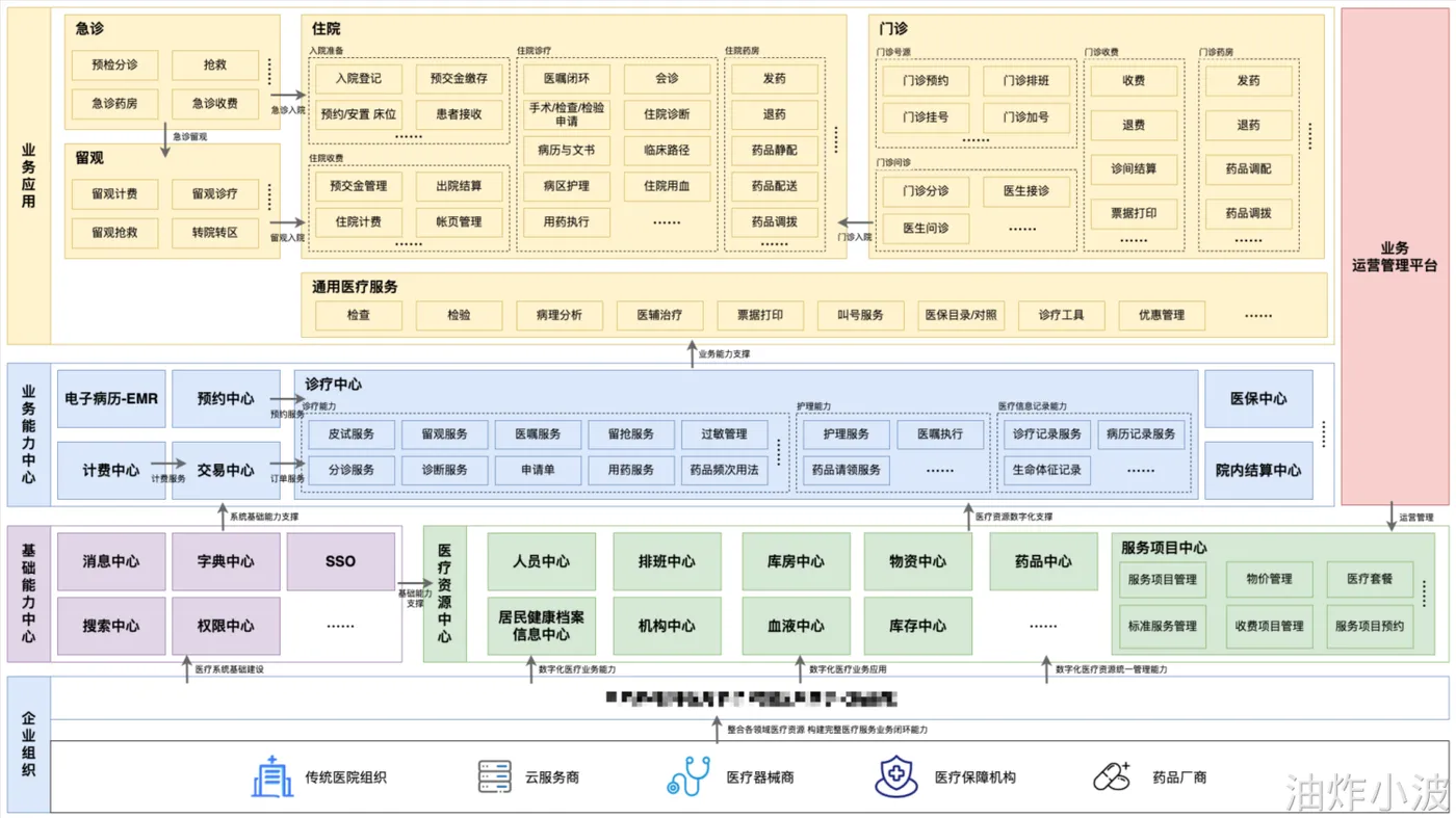 如图所示,我们可以将业务应用层分为门诊、住院、急诊、留观和通用医疗服务这五个模块,每个模块都可以在细化其功能矩阵。