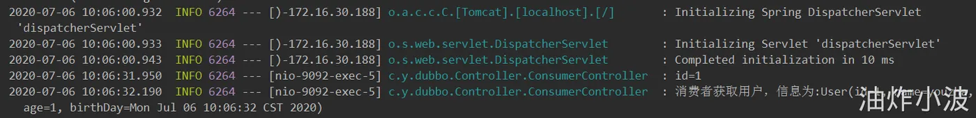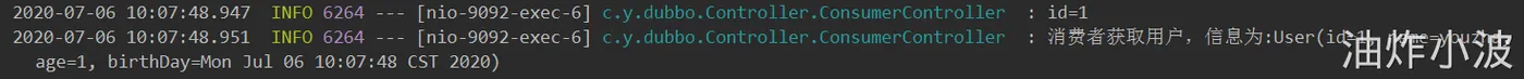 此时直接通过自身IP访问消费者,地址:http://localhost:9092/consumer/getUserById?id=1,查看日志: