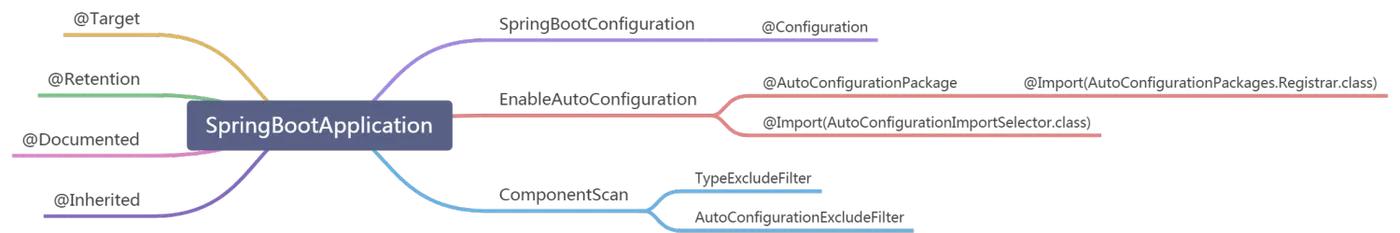 SpringBoot主启动类被@SpringBootApplication所修饰,点击进去该注解,出现上图,会发现其为组合注解,本章节将会基于注解进行解释其自动装配在源码层面是怎么实现的,完整的注解调用链路如下图所示:
