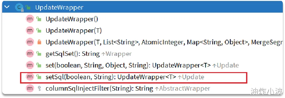 在这个体系中,AbstractWrapper定义了各种查询的条件,如:eq、in、between、like、gt、lt等。也就是说借助于他可以完成单表各种场景的查询条件组装。那为什么他又有QueryWrapper、UpdateWrapper呢?这是因为我们一个完整的查询语句是:SELECT 字段 FROM 表名 WHERE 条件