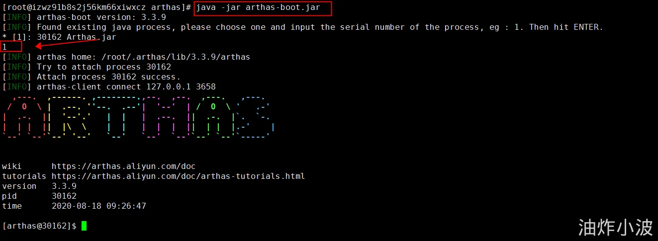 安装运行前提是服务器上有java进程在进行,可以看到Arthas是支持多个Java进程的处理的,只要选择对应的序号即可。本章节很简单,之后我们再来具体看看Arthas能做什么。