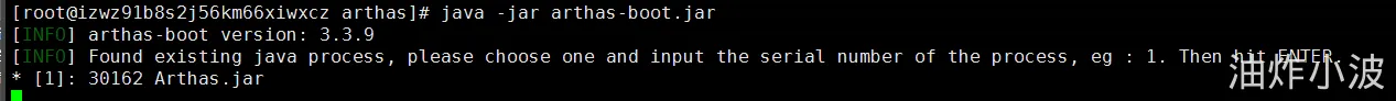 启动完之后他会提示选择对应的Java进程,我这里只有一个应用,即:Arthas.jar,所以这里我输入1