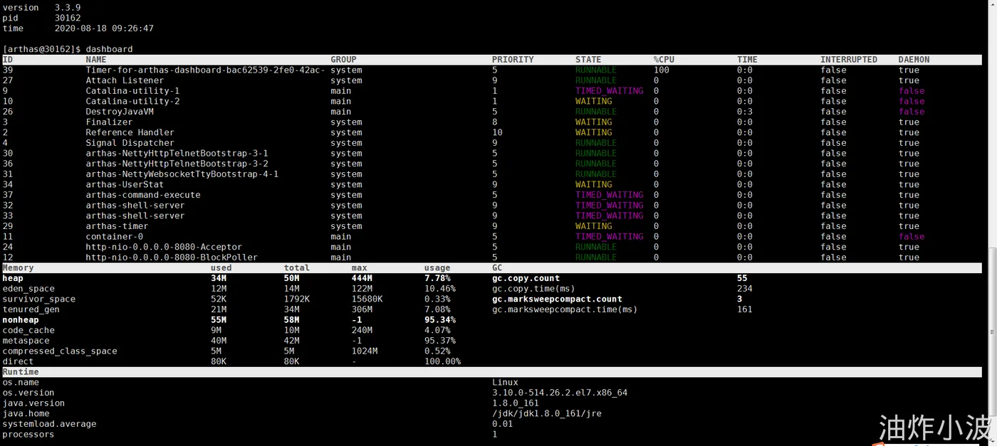 输入dashboard,按回车/enter,会展示当前进程的信息,按ctrl+c可以中断执行