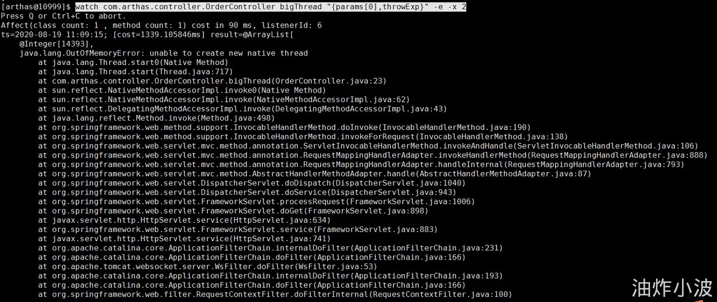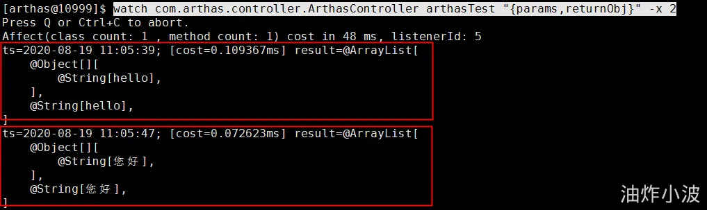 watch com.arthas.controller.ArthasController arthasTest "{params,returnObj}" -x 2