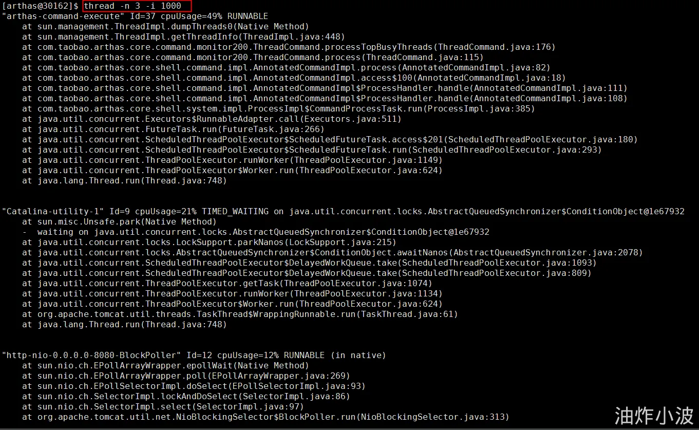 "http-bio-8080-exec-4" Id=27 TIMED_WAITING at java.lang.Thread.sleep(Native Method) at test.arthas.TestThreadBlocking.doGet(TestThreadBlocking.java:22) - locked java.lang.Object@725be470 <---- but blocks 4 other threads! at javax.servlet.http.HttpServlet.service(HttpServlet.java:624) at javax.servlet.http.HttpServlet.service(HttpServlet.java:731) at org.apache.catalina.core.ApplicationFilterChain.internalDoFilter(ApplicationFilterChain.java:303) at org.apache.catalina.core.ApplicationFilterChain.doFilter(ApplicationFilterChain.java:208) at org.apache.tomcat.websocket.server.WsFilter.doFilter(WsFilter.java:52) at org.apache.catalina.core.ApplicationFilterChain.internalDoFilter(ApplicationFilterChain.java:241) at org.apache.catalina.core.ApplicationFilterChain.doFilter(ApplicationFilterChain.java:208) at test.filter.TestDurexFilter.doFilter(TestDurexFilter.java:46) at org.apache.catalina.core.ApplicationFilterChain.internalDoFilter(ApplicationFilterChain.java:241) at org.apache.catalina.core.ApplicationFilterChain.doFilter(ApplicationFilterChain.java:208) at org.apache.catalina.core.StandardWrapperValve.invoke(StandardWrapperValve.java:220) at org.apache.catalina.core.StandardContextValve.invoke(StandardContextValve.java:122) at org.apache.catalina.authenticator.AuthenticatorBase.invoke(AuthenticatorBase.java:505) at com.taobao.tomcat.valves.ContextLoadFilterValve$FilterChainAdapter.doFilter(ContextLoadFilterValve.java:191) at com.taobao.eagleeye.EagleEyeFilter.doFilter(EagleEyeFilter.java:81) at com.taobao.tomcat.valves.ContextLoadFilterValve.invoke(ContextLoadFilterValve.java:150) at org.apache.catalina.core.StandardHostValve.invoke(StandardHostValve.java:170) at org.apache.catalina.valves.ErrorReportValve.invoke(ErrorReportValve.java:103) at org.apache.catalina.core.StandardEngineValve.invoke(StandardEngineValve.java:116) at org.apache.catalina.connector.CoyoteAdapter.service(CoyoteAdapter.java:429) at org.apache.coyote.http11.AbstractHttp11Processor.process(AbstractHttp11Processor.java:1085) at org.apache.coyote.AbstractProtocol$AbstractConnectionHandler.process(AbstractProtocol.java:625) at org.apache.tomcat.util.net.JIoEndpoint$SocketProcessor.run(JIoEndpoint.java:318) - locked org.apache.tomcat.util.net.SocketWrapper@7127ee12 at java.util.concurrent.ThreadPoolExecutor.runWorker(ThreadPoolExecutor.java:1142) at java.util.concurrent.ThreadPoolExecutor$Worker.run(ThreadPoolExecutor.java:617) at org.apache.tomcat.util.threads.TaskThread$WrappingRunnable.run(TaskThread.java:61) at java.lang.Thread.run(Thread.java:745) Number of locked synchronizers = 1 - java.util.concurrent.ThreadPoolExecutor$Worker@31a6493e