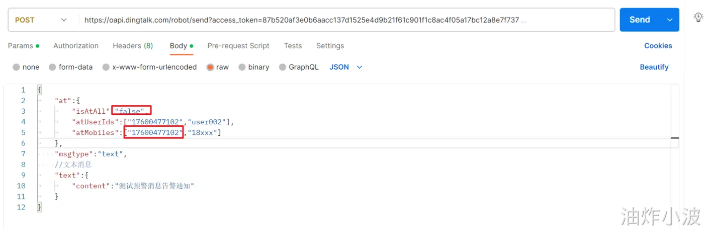 - at,标识群里@哪些人,如果isAtAll就标识@群里所有人,@atMobiles标识指定手机号,其余参数同理