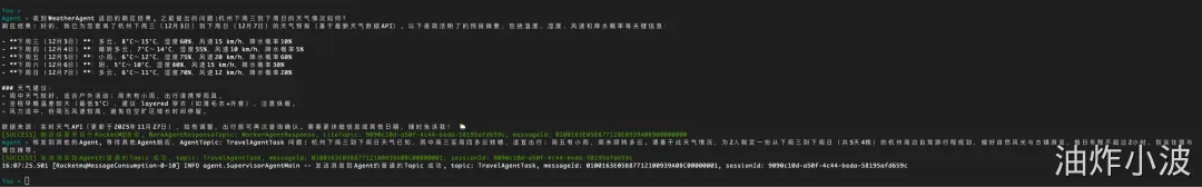 - SupervisorAgent 监听到上述消息,获取了天气查询结果,然后向消息队列发送一条消息 杭州下周三至周日天气已知,天气为***,请基于此制定一份从杭州出发的周边2人3天4晚自驾游行程规划(下周三出发,周日返回),包含住宿、餐饮与景点推荐。