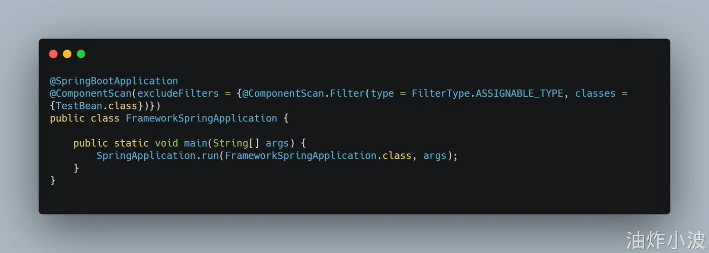 @ComponentScan(excludeFilters = {@ComponentScan.Filter(type = FilterType.ASSIGNABLE_TYPE, classes = {TestBean.class})})