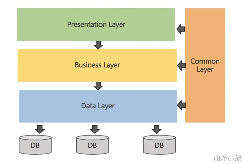 单体应用架构一般是比较传统的分为4层:数据层(Data Layer)、应用逻辑层(Business Layer)、表现层(Presentation Layer)和基础通用层(Common Layer)。