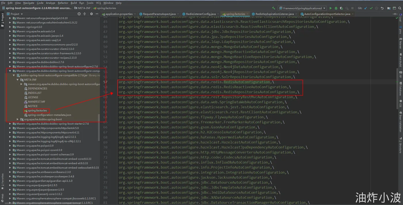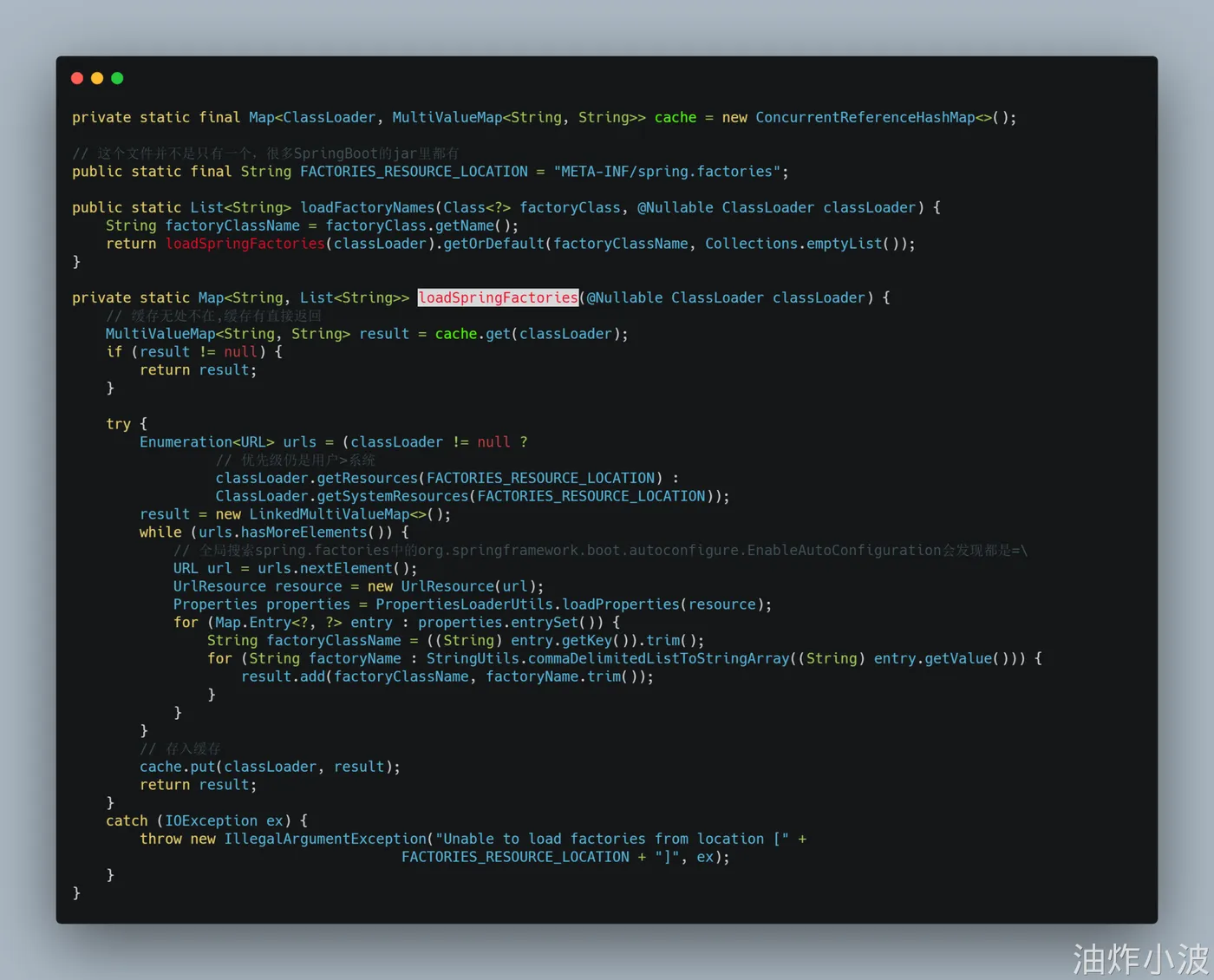 关于SpringFactoriesLoader.loadFactoryNames方法,这里还是需要说明一下,关键就在于这个方法,帮我们实现的全局自动配置