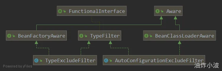 关于@AutoConfigurationExcludeFilter,能搜到的资料很少,区别就在于多了一部分AutoConfiguration,所以我目前的认知是:二者都能用来处理组件过滤,但是是TypeFilter接口的两种实现,一种主要服务于主启动类组件,一种服务于自动配置的组件,二者结合实现一个完整的组件过滤。