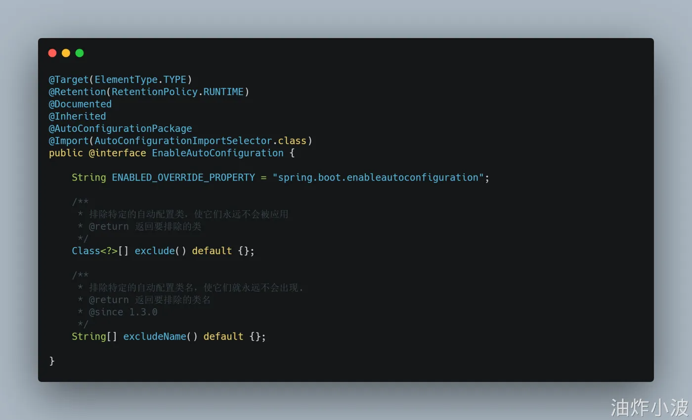 Enable auto-configuration of the Spring Application Context, attempting to guess and configure beans that you are likely to need. Auto-configuration classes are usually applied based on your classpath and what beans you have defined. For example, if you have {@code tomcat-embedded.jar} on your classpath you are likely to want a {@link TomcatServletWebServerFactory} (unless you have defined your own {@link ServletWebServerFactory} bean). -- Spring的自动配置上下文,会大致预估你需要使用的Bean,其依据就是项目中classpath中的jar、配置文件+我们自己定义的Bean(借助于上面SpringFramework的方式之一),举例:比如引入了tomcat-embedded.jar,那么自动配置认为你大概率会使用TomcatServletWebServerFactory,于是就帮你初始化,除非你自己定义了一个自定义Bean:ServletWebServerFactory,即:自定义的优先级>系统默认配置,同级覆盖 When using {@link SpringBootApplication @SpringBootApplication}, the auto-configuration of the context is automatically enabled and adding this annotation has therefore no additional effect. -- 当使用@SpringBootApplication注解时,自动配置注解再加到主启动类上不会有什么用,也是因为@SpringBootApplication注解是组合注解,其内部已经包含了自动配置的注解 Auto-configuration tries to be as intelligent as possible and will back-away as you define more of your own configuration. You can always manually {@link #exclude()} any configuration that you never want to apply (use {@link #excludeName()} if you don't have access to them). You can also exclude them via the {@code spring.autoconfigure.exclude} property. Auto-configuration is always applied after user-defined beans have been registered. -- 自动化配置会尽可能地智能化,当你的配置和自动化配置一致时,自动化配置自动就会失效。即用户配置>自动化配置权限。对于你不需要自动化配置的,可以通过exclude进行手动排除(就像上面2.3小结我们举例的 @ComponentScan(excludeFilters = {@ComponentScan.Filter(type = FilterType.ASSIGNABLE_TYPE, classes = {TestBean.class})})),当然你也可以在配置文件中进行排除:spring.autoconfigure.exclude。 最后说了下,自动化配置的永远在用户定义的Bean注册之后进行。 The package of the class that is annotated with {@code @EnableAutoConfiguration}, usually via {@code @SpringBootApplication}, has specific significance and is often used as a 'default'. For example, it will be used when scanning for {@code @Entity} classes. It is generally recommended that you place {@code @EnableAutoConfiguration} (if you're not using {@code @SpringBootApplication}) in a root package so that all sub-packages and classes can be searched. -- 就是说@SpringBootApplication,@EnableAutoConfiguration标注的类是具备意义的,一般会被系统认作默认配置启动类,因此建议标注有 @SpringBootApplication注解的文件最好放在根包中,这样所有的子包才能被扫描到。 Auto-configuration classes are regular Spring {@link Configuration @Configuration} beans. They are located using the {@link SpringFactoriesLoader} mechanism (keyed against this class). Generally auto-configuration beans are {@link Conditional @Conditional} beans (most often using {@link ConditionalOnClass @ConditionalOnClass} and {@link ConditionalOnMissingBean @ConditionalOnMissingBean} annotations). -- 被@Configuration标注的Spring的Bean就被认为是一个配置类,等同于ApplicationContext.xml,采用SpringFactoriesLoader机制,自动装配Bean常用以下注解实现:@Conditional,@ConditionalOnClass,@ConditionalOnMissingBean