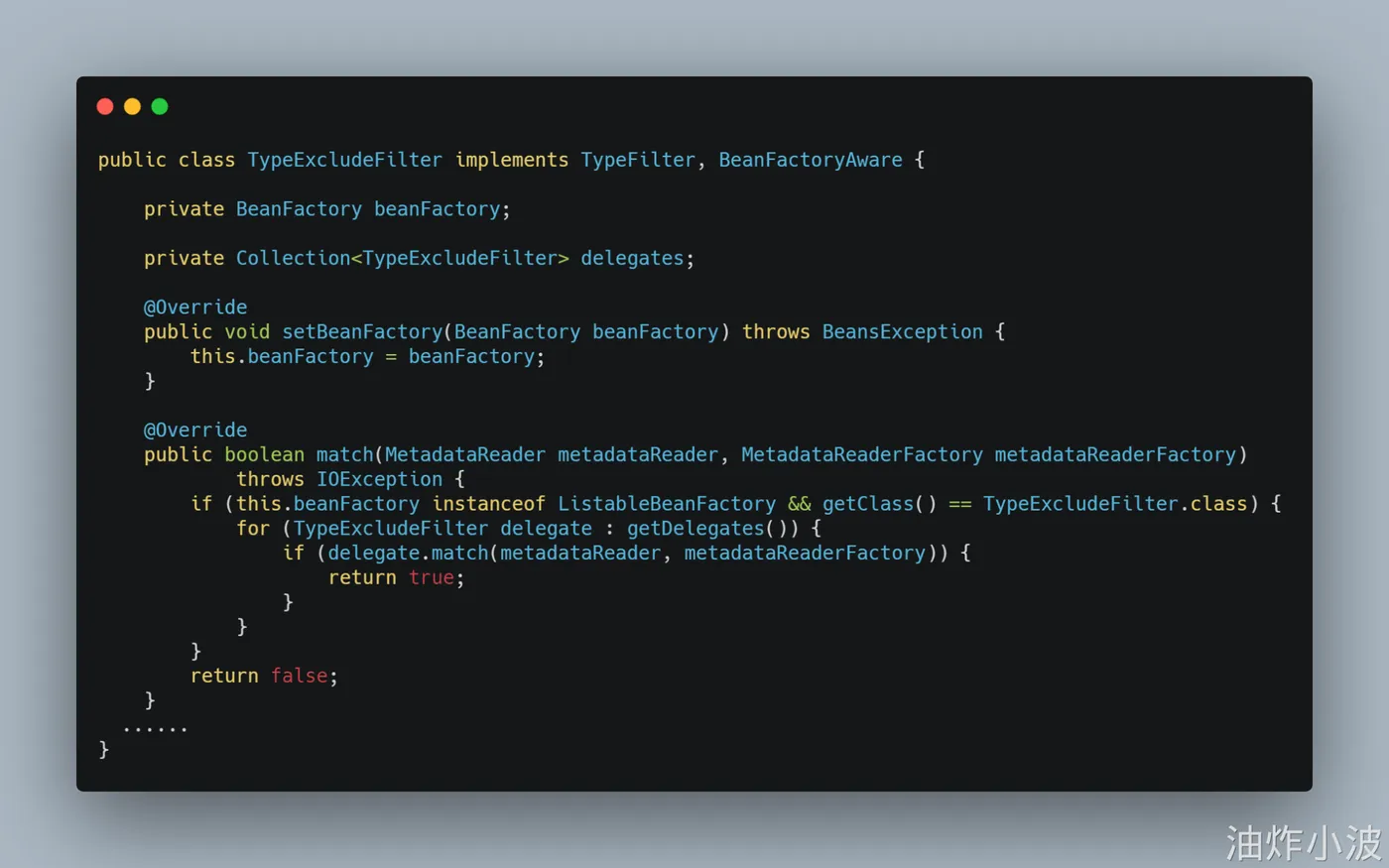 TypeExcludeFilter核心方法为match(),其关键作用在于:拓展组件的过滤,提供一种扩展机制,能让我们向IOC容器中注册一些自定义的组件过滤器,以在包扫描的过程中过滤它们。会从 BeanFactory 中获取所有类型为 TypeExcludeFilter 的组件,去执行自定义的过滤方法。