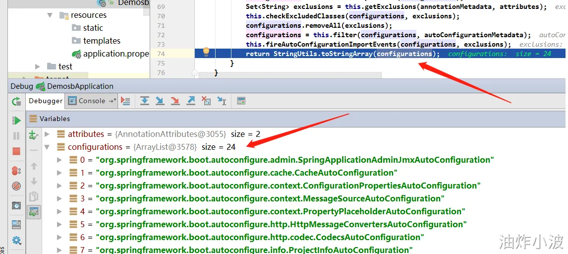 protected AutoConfigurationEntry getAutoConfigurationEntry(AutoConfigurationMetadata autoConfigurationMetadata, AnnotationMetadata annotationMetadata) { if (!isEnabled(annotationMetadata)) { return EMPTY_ENTRY; } // 1.获取所有的attributes AnnotationAttributes attributes = getAttributes(annotationMetadata); // 2.SPI机制加载自动配置类configurations List<String> configurations = getCandidateConfigurations(annotationMetadata, attributes); // 3.步骤2结果去重 configurations = removeDuplicates(configurations); // 4.基于1获取全部去重的Exclusion【过滤限制的配置项】 Set<String> exclusions = getExclusions(annotationMetadata, attributes); /** * 5.检查是否有无效Exclusion,有则抛出IllegalStateException * The following classes could not be excluded because they are not auto-configuration classes * 不能排除下列类,因为它们不是自动配置类 */ checkExcludedClasses(configurations, exclusions); // 6.清空configurations中的exclusions configurations.removeAll(exclusions); // 7.重新生成configurations,前面4.2的继承体系在这里发挥作用 configurations = filter(configurations, autoConfigurationMetadata); fireAutoConfigurationImportEvents(configurations, exclusions); return new AutoConfigurationEntry(configurations, exclusions); }