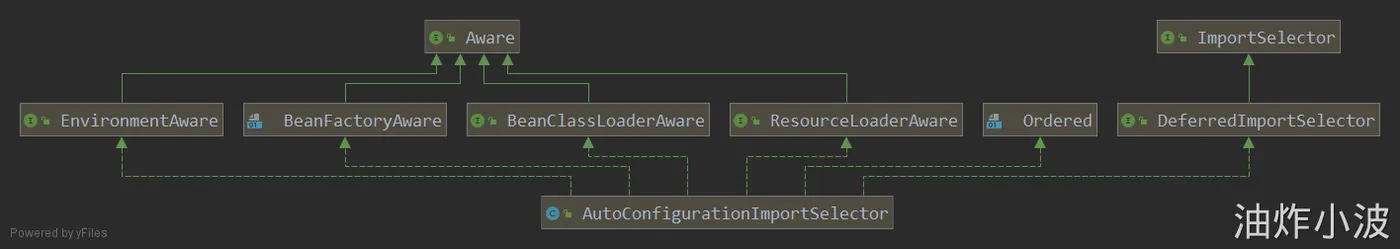 下面是AutoConfigurationImportSelector的继承关系视图,可以看到他继承了一系列的Aware接口,这也就保证了Bean在被初始化之后,能够获取对应的Aware资源【Aware系列在Spring的Bean声明周期中有强烈存在感,不是很清楚的可以百度下】