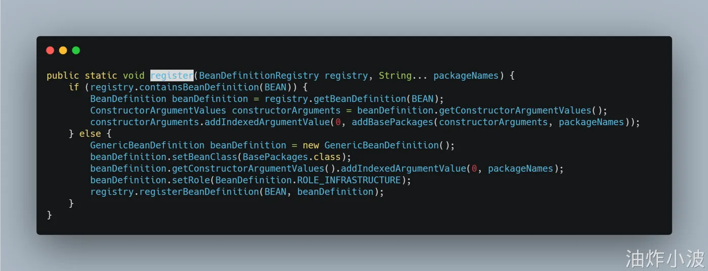 这个是官方提供的registerBeanDefinitions方法的释义,重点就在: