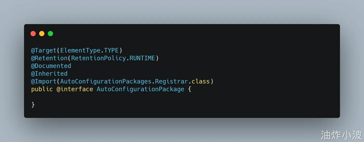 - @AutoConfigurationPackage:AutoConfigurationPackages.Registrar.class