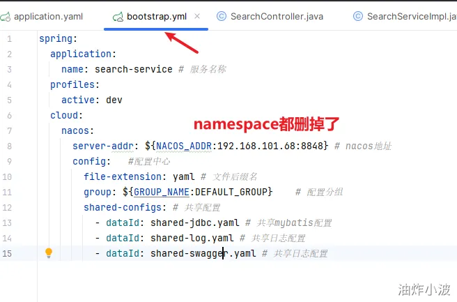 spring: application: name: search-service # 服务名称 profiles: active: dev cloud: nacos: server-addr: ${NACOS_ADDR:192.168.101.68:8848} # nacos地址 config: #配置中心 file-extension: yaml # 文件后缀名 group: ${GROUP_NAME:DEFAULT_GROUP} # 配置分组 shared-configs: # 共享配置 - dataId: shared-jdbc.yaml # 共享mybatis配置 - dataId: shared-log.yaml # 共享日志配置 - dataId: shared-swagger.yaml # 共享日志配置