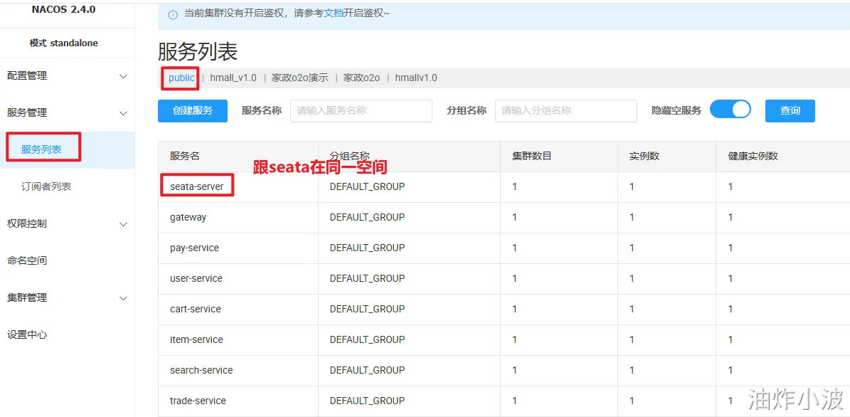 - 个别同学会遇到seata报错,是因为docker里面的seata部署在public命名空间,我们的服务是自创的一个namespace,所以建议大家把namespace都拿掉,或者重新部署docker里面的seata,我采纳了前者
