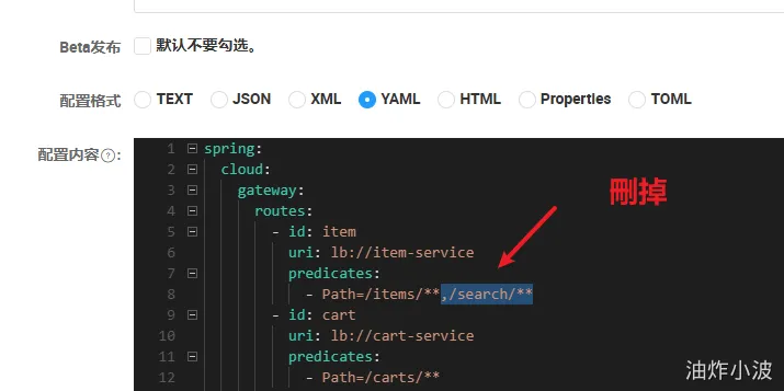 spring: cloud: gateway: # default-filters: # - name: FirstFilter routes: - id: item # 路由规则id,自定义,唯一 uri: lb://item-service # 路由的目标服务,lb代表负载均衡,会从注册中心拉取服务列表 predicates: # 路由断言,判断当前请求是否符合当前规则,符合则路由到目标服务 - Path=/items/** # 这里是以请求路径作为判断规则 # - Header=X-Request-Id,\d+ #表示数字 - id: product uri: lb://item-service predicates: - Path=/product/** filters: - StripPrefix=1 - id: productb uri: lb://item-service predicates: - Path=/productb/** - Header=X-Tag, new filters: - StripPrefix=1 - id: cart uri: lb://cart-service predicates: - Path=/carts/** - id: user uri: lb://user-service predicates: - Path=/users/**,/addresses/** - id: trade uri: lb://trade-service predicates: - Path=/orders/** - id: pay uri: lb://pay-service predicates: - Path=/pay-orders/** - id: search uri: lb://search-service predicates: - Path=/search/** hm: jwt: location: classpath:hmall.jks # 秘钥地址 alias: hmall # 秘钥别名 password: hmall123 # 秘钥文件密码 tokenTTL: 30m # 登录有效期 auth: excludePaths: # 无需登录校验的路径 - /search/** - /users/login - /items/** - /productb/**