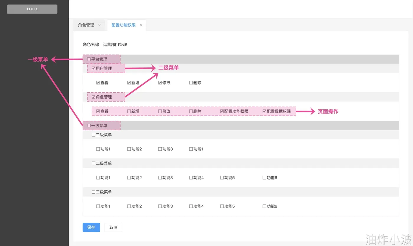 还有一种除了登录的认证之外的场景:系统在登录的瞬间,判断用户的角色,从而得到下图左侧的不同菜单树。这种我们叫做权限管理中的授权场景,如下: