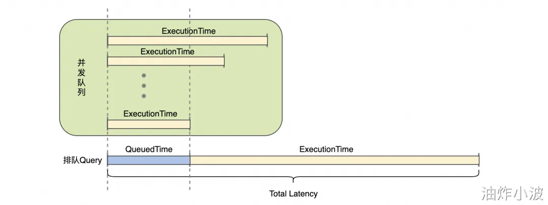 其实,了解了上面的并发控制模型,就不难理解这一点:当一条 SQL 提交时,如果并发队列满,该 SQL 将在排队队列中等待,直到并发队列中最短的一条 SQL 执行完才能腾出空位来,这个时间间隔称为“QueuedTime(排队时间)”,所以,当出现排队时,SQL 端到端的总延时可能会增高,这其中包含了队列中等待在途 Query 完成的排队时间。
