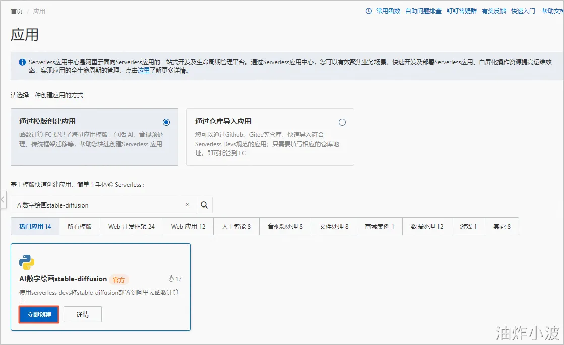 - 在应用页面,搜索并选择AI数字绘画stable-diffusion,单击立即创建。