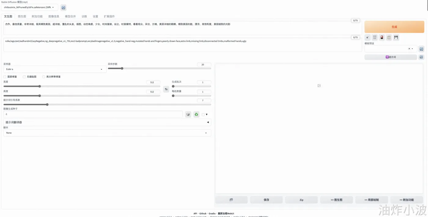 16. 加载完成之后,返回如下页面,表示您已成功进入Stable Diffusion WebUI的操作界面。我们已为您预置了默认的提示词,协助你快速生成第一张图片