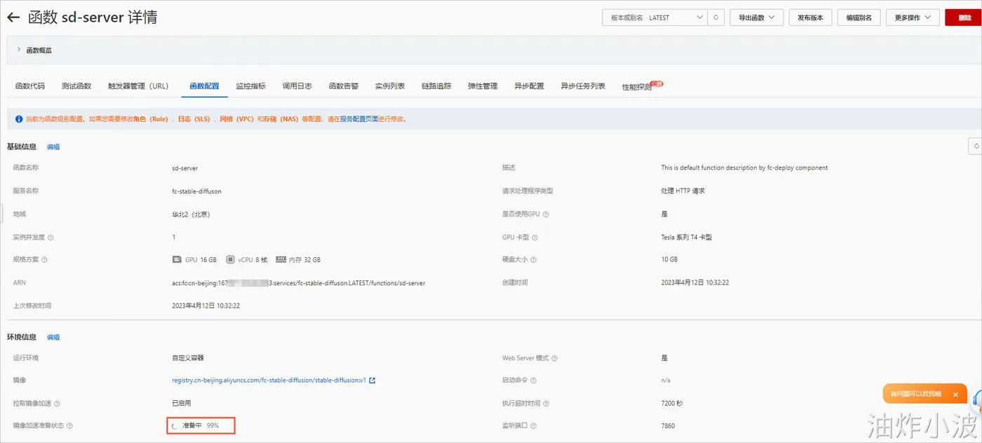 14.3 在函数sd-server详情页面的环境信息区域,检查镜像加速准备状态,请您耐心等待镜像加速准备状态变为可用。
