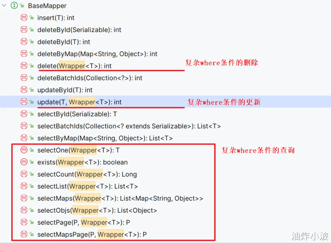 MyBatis Plus 是在 MyBatis 的基础上进行增强的工具,提供了丰富的 API 来简化数据访问层的开发。常见的api有如下图: