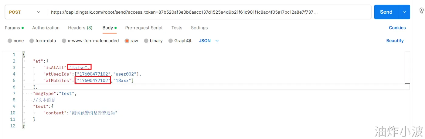 • at,标识群里@哪些人,如果isAtAll就标识@群里所有人,@atMobiles标识指定手机号,其余参数同理