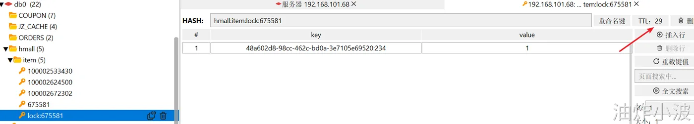 重启商品服务,调用更新商品信息接口,获取锁成功,通过redis客户端观察分布式锁的自动续期功能