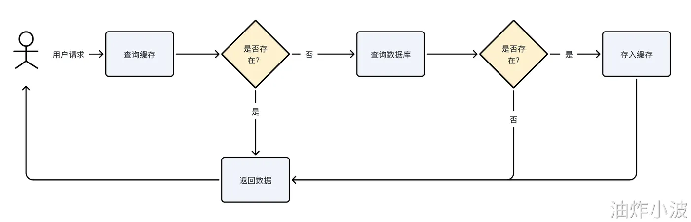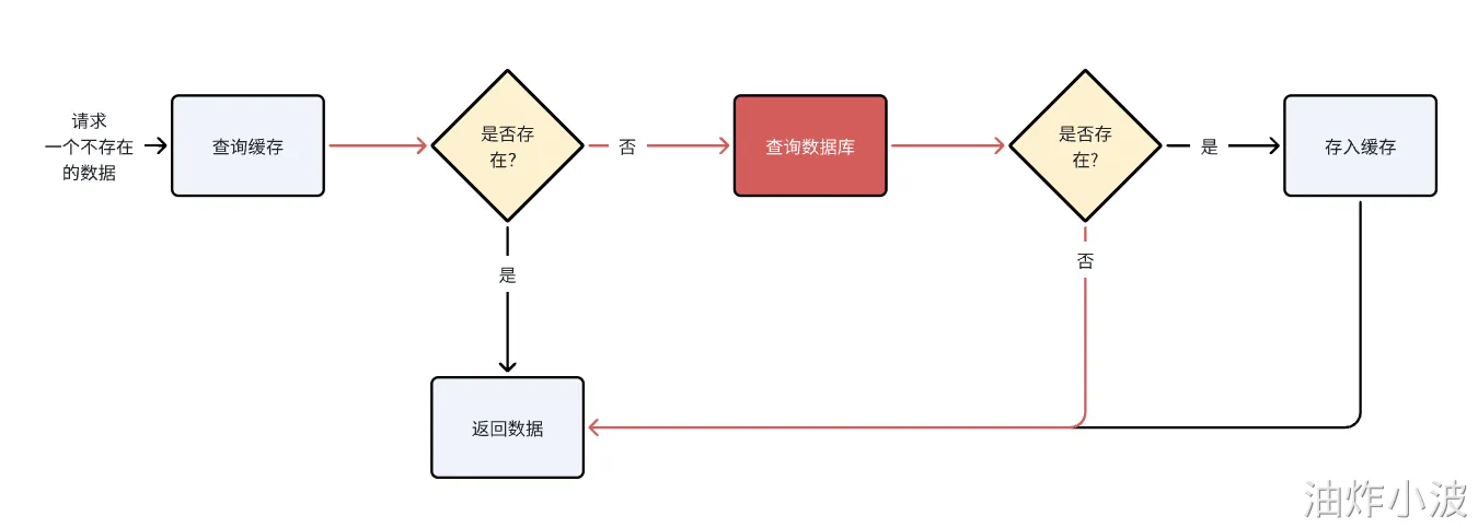 查询一个缓存中不存在的数据将会执行方法查询数据库,数据库也不存在此数据,查询完数据库也没有缓存数据,缓存没有起到作用。
